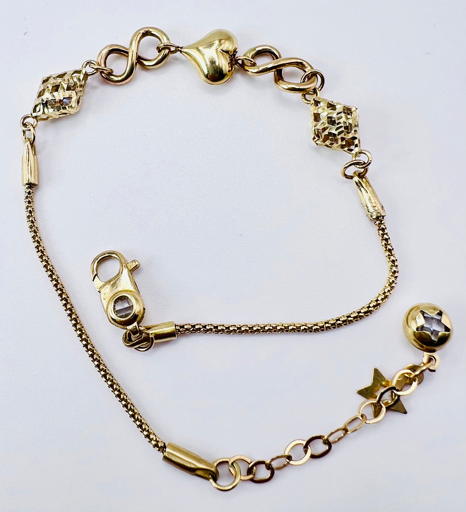 This heart bracelet delicately adorns your wrist with luxurious elegance. Made of 100% pure gold, it is a timeless piece that symbolizes love and devotion. A must-have for any fashionable individual with discerning taste.