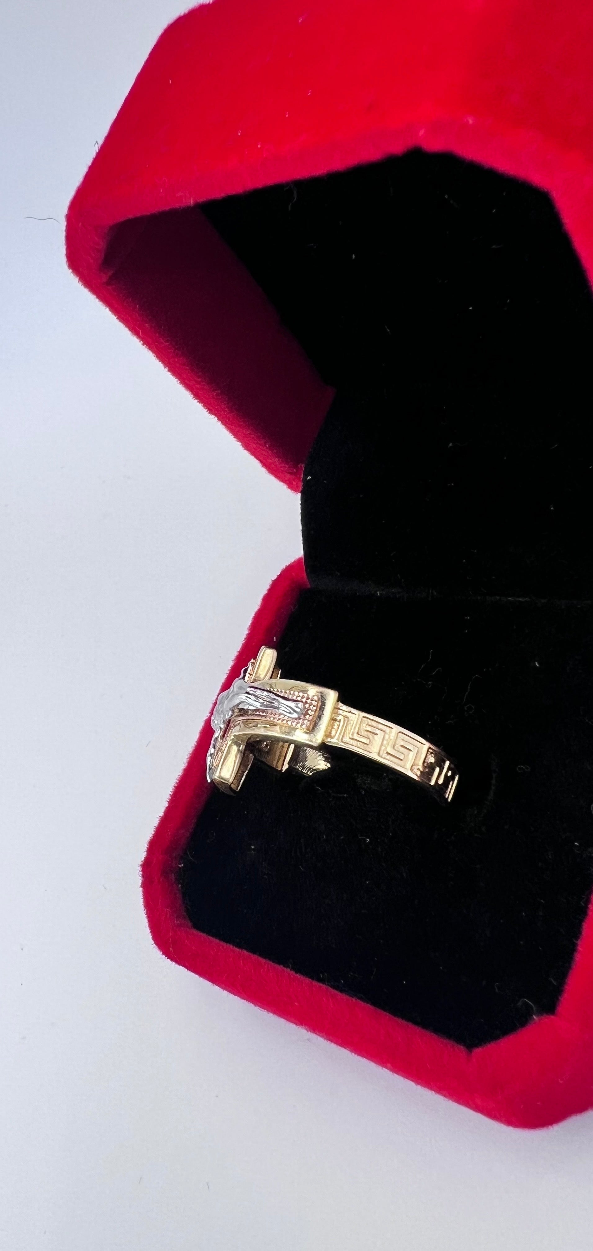 Elevate your style with our exclusive JESUS ON CROSS RING. Crafted in luxurious 3 tone color gold, this ring features a stunning depiction of Jesus on the cross. Add a touch of elegance and spirituality to any outfit with this sophisticated piece.